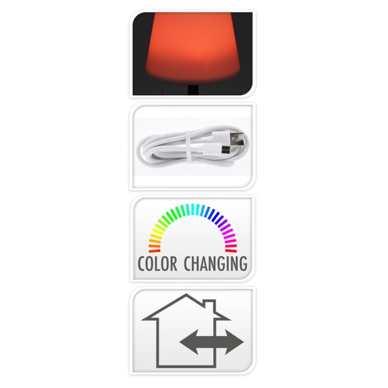 Denne bordslampen med fargeskift skaper hyggelig stemning i bobil, campingvogn eller fortelt. Lyset skifter mykt mellom ulike farger og gir en dekorativ belysning på bordet eller uteplassen.