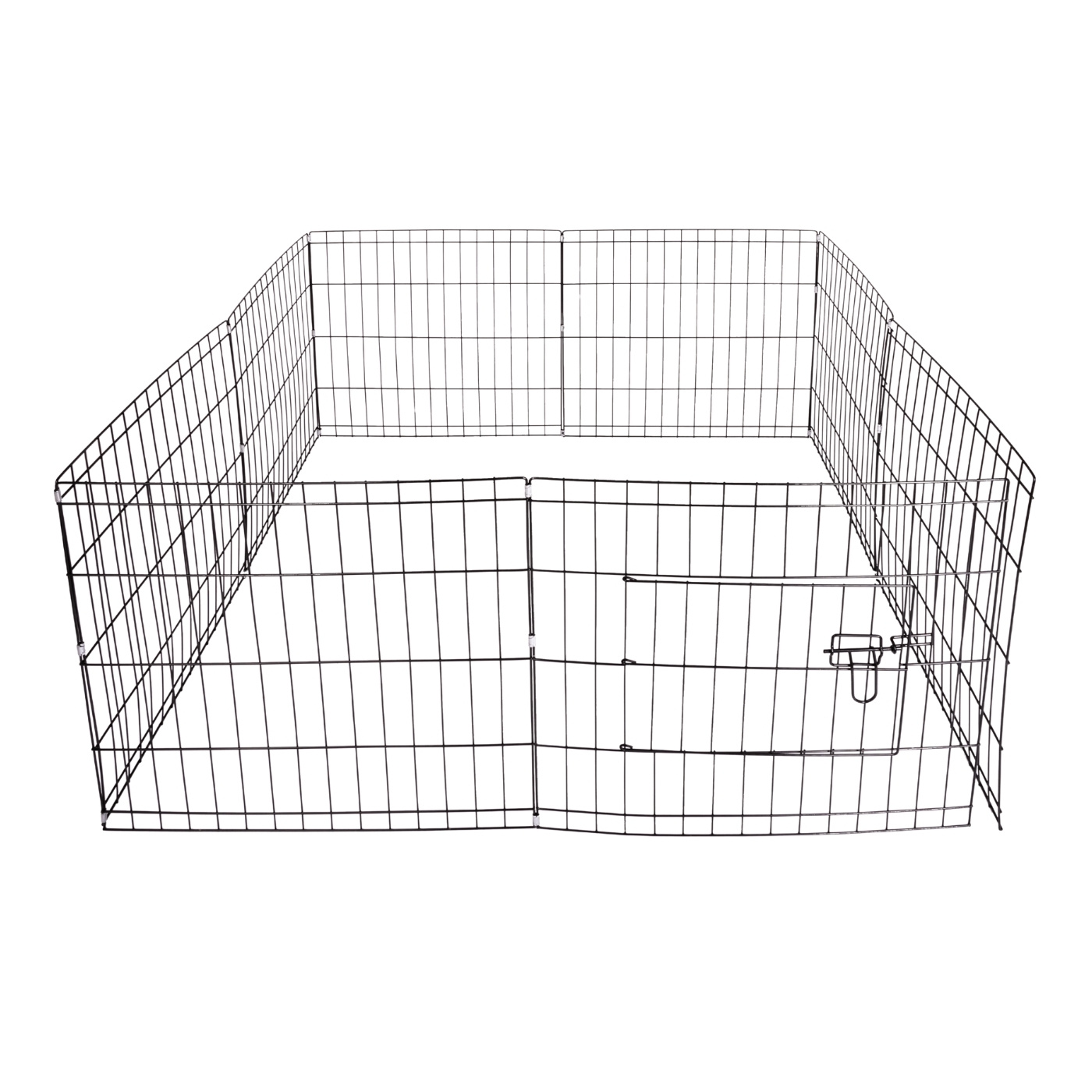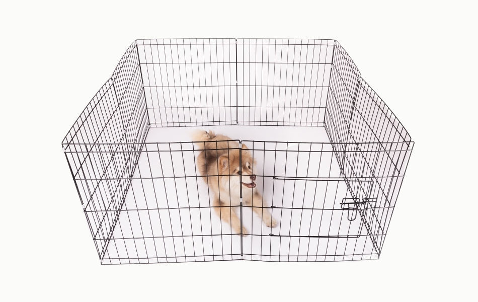 De åtte seksjonene monteres enkelt sammen og kan plasseres i ulike former avhengig av plass og behov. Konstruksjonen gjør det lett å tilpasse innhegningen for både valper og voksne hunder.