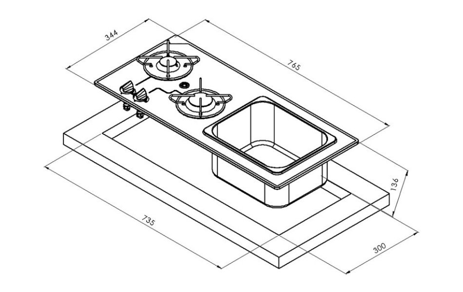 Komfyren har to kraftige brennere med en total effekt på 2,8 kW og er utstyrt med tennsikring for økt sikkerhet. Det robuste lokket i 8 mm herdet sikkerhetsglass gir et eksklusivt utseende og kan brukes som ekstra arbeidsflate når komfyren ikke er i bruk.