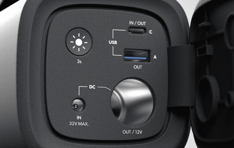 - Samtidig lading via 12 V, USB C og USB A