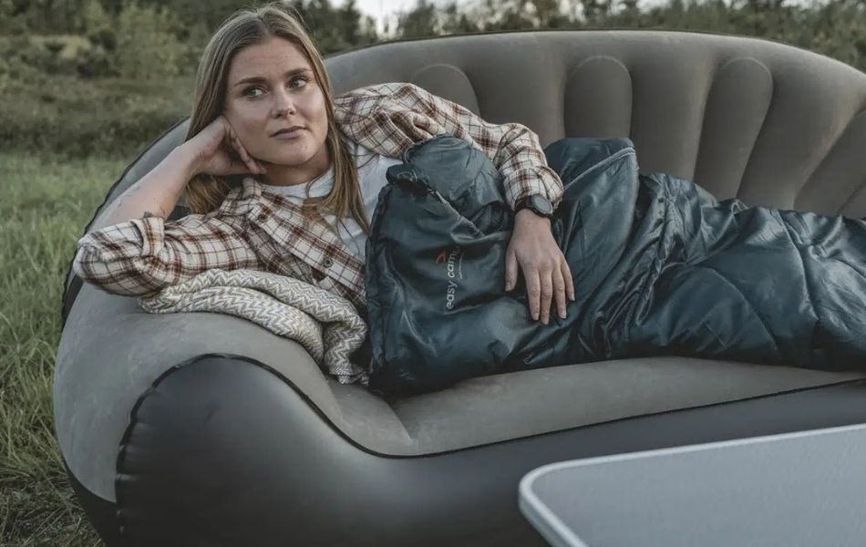 Oppblåsbar sofa med myk flokk overflate og god plass, perfekt for campingvogn, bobil og camping.