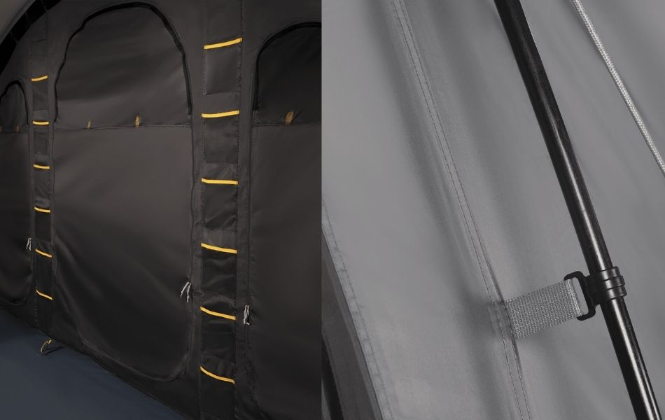 Den store frontmarkisen gir ekstra plass til avslapning eller oppbevaring, mens mørklagt soveområde og flere dører foran og på siden bidrar til både komfort og fleksibilitet. Dawlish finnes i flere størrelser og passer like godt for korte turer som lengre ferier.