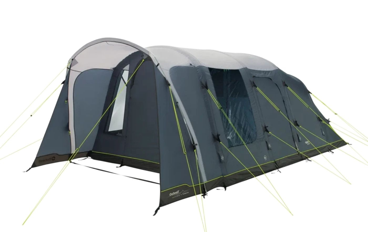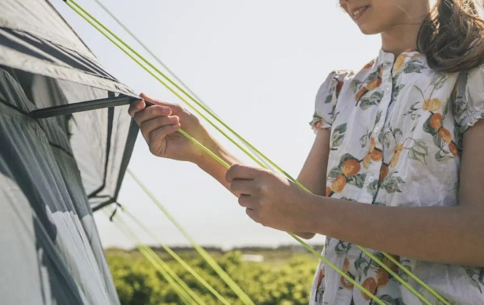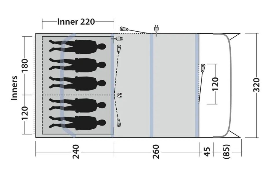 Teltet rommer opptil fem personer i to mørklagte soverom og gir komfortabel innkvartering for familieeventyr. Ventilasjon via mesh-paneler og ekstra sidedører sikrer frisk luft og fleksibilitet etter behov. Det lyse, varmt tonede yttertaket skaper en hyggelig og innbydende atmosfære innendørs.