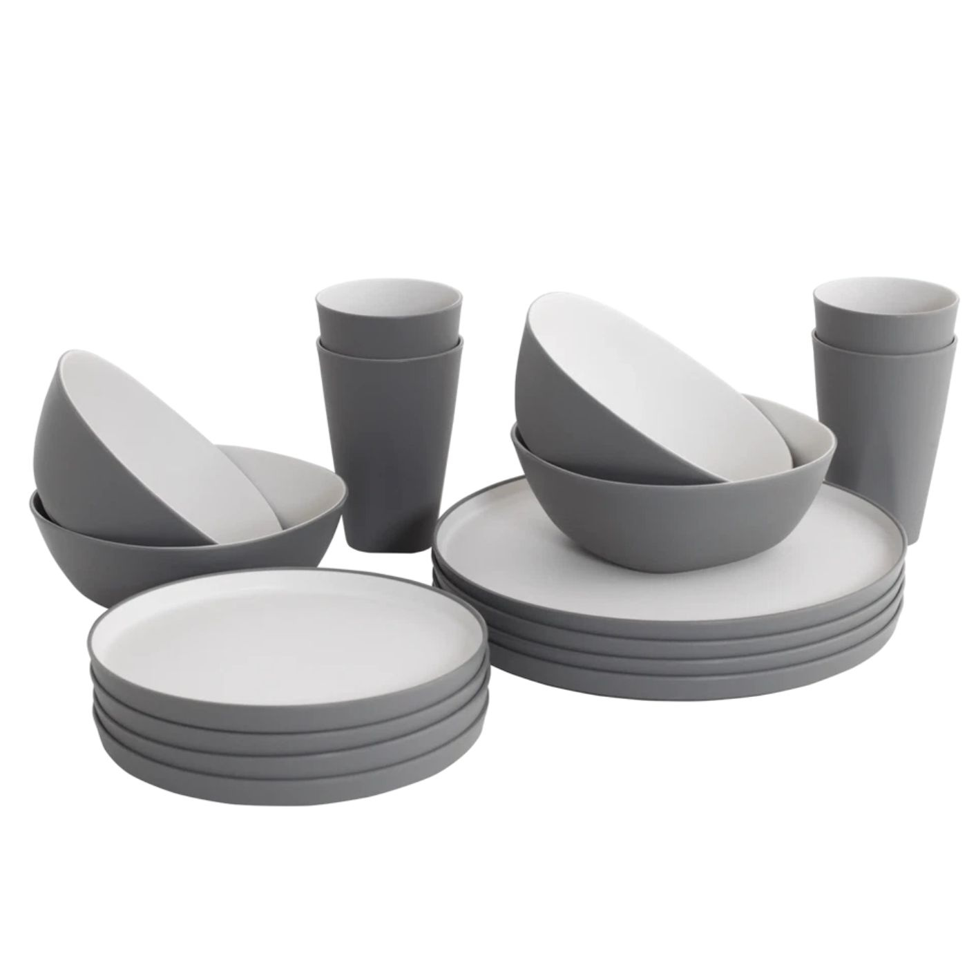 Settet inneholder tallerkener, skåler og krus og er utviklet for å tåle et aktivt friluftsliv. Det robuste materialet gjør serviset trygt å bruke også i kjøretøy der stabilitet er viktig. Krusene har håndtak og kan stables for enkel og plassbesparende oppbevaring. Den sklisikre undersiden reduserer både lyd og bevegelse under transport.