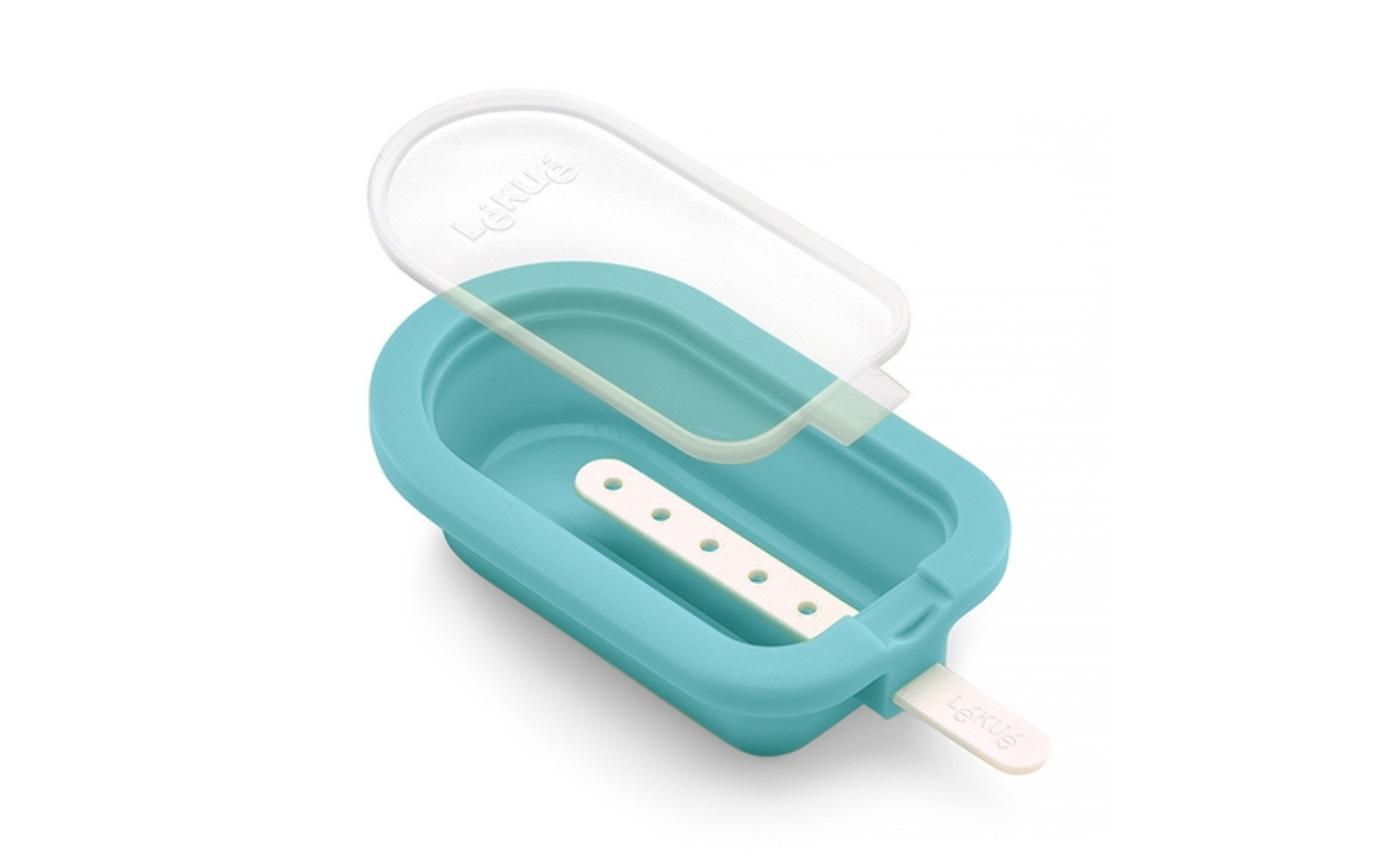 Fyll formene med blandingen din, sett i pinnen, sett på lokket og plasser i fryseren i cirka 4 timer. Den fleksible silikonformen gjør det enkelt å få ut isen uten at den går i stykker.