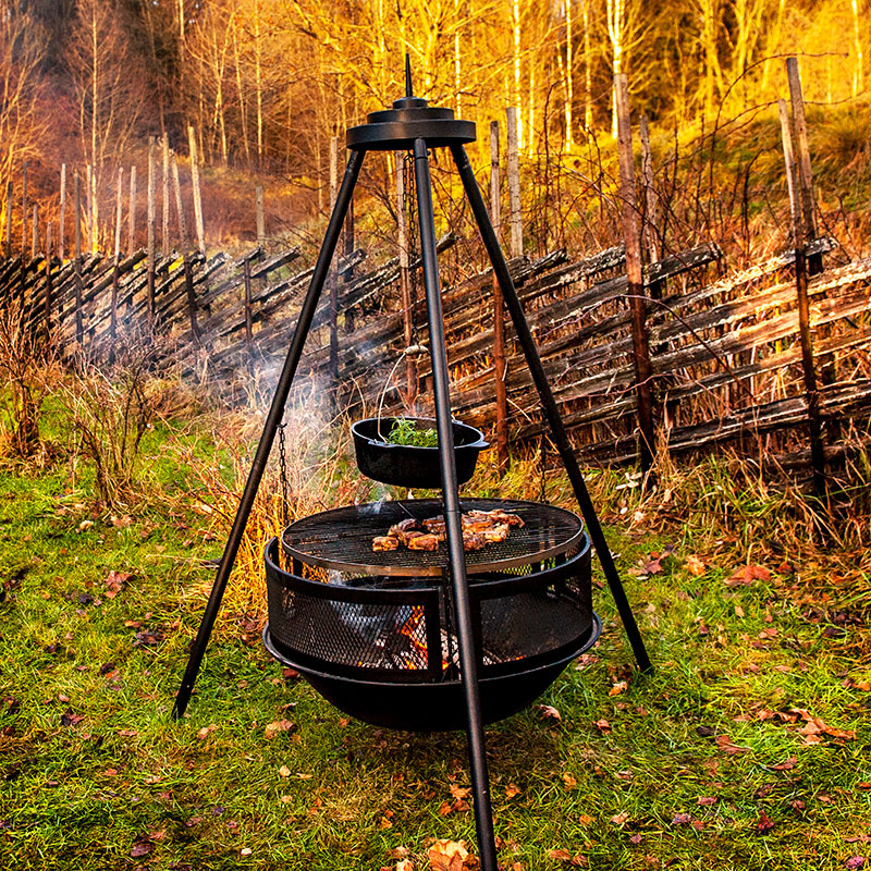 Med en diameter på hele 80 cm er det plass til mye mat på grillristen. Bålpanna Jette henger over bakken på et stativ med tre kraftige ben som gjør bålet sikkert.