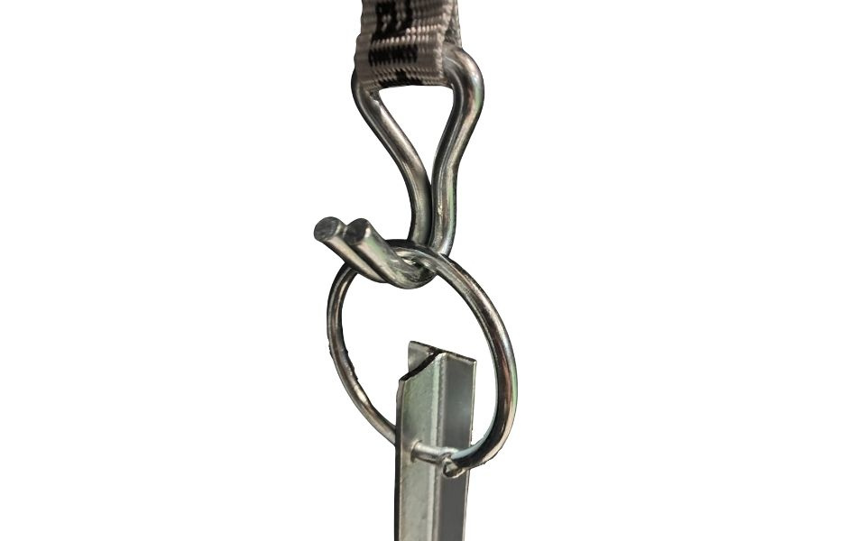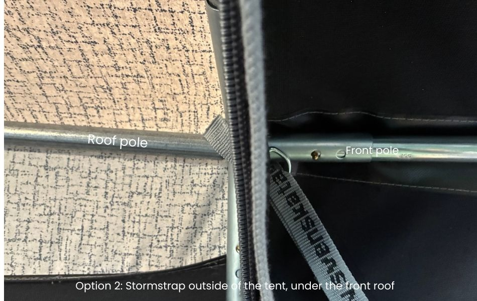 Monteringsalternativ 2: Se bilde 3, rundt hjørnet av hjørnekrysset ved takstang mot baldakinstang, der holderen på det korte båndet skal tres ut mot utsiden gjennom hullet, deretter trekkes stormbåndet skrått ned mot ytterhjørnet. Dette alternativet anbefales primært.