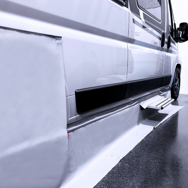 Underlaget består av to deler: en lang del mellom hjulene og en separat del for bakhjulene. Laget av slitesterk PVC som gir lang levetid og beskytter mot vær og vind. Magneter og elastiske stropper sikrer enkel og skrufri montering uten hull i campervanen.
