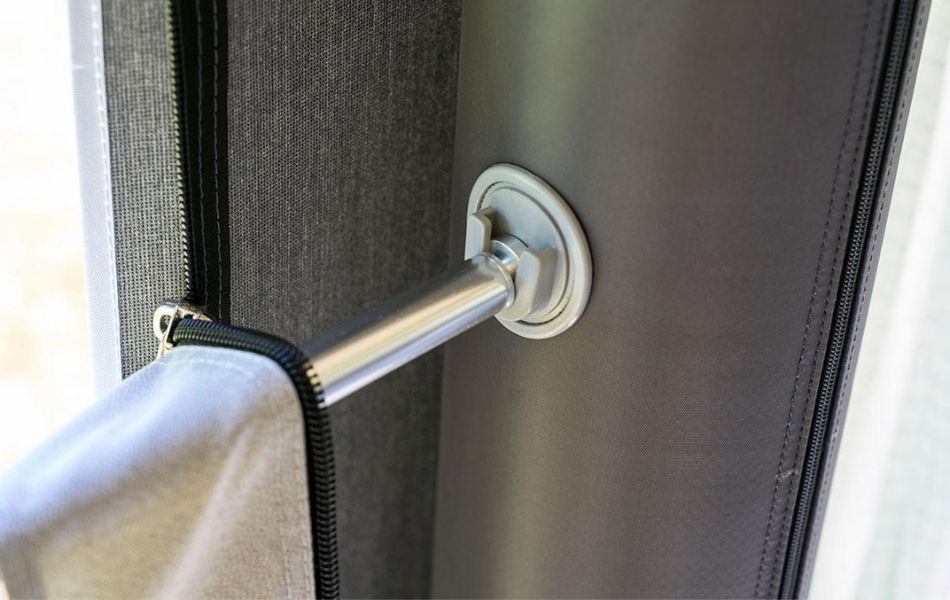 Sider og fronter kan åpnes helt for å gjøre forteltet til et stort, åpent soltak, eller delvis for å lage ekstra dører og ventilasjon på varme dager. Integrerte myggnett på sidene gir et behagelig innendørsklima uten at insekter slipper inn. Den medfølgende verandastangen gjør det enkelt å lage en koselig veranda hvis du vil ha et delvis åpent område foran.